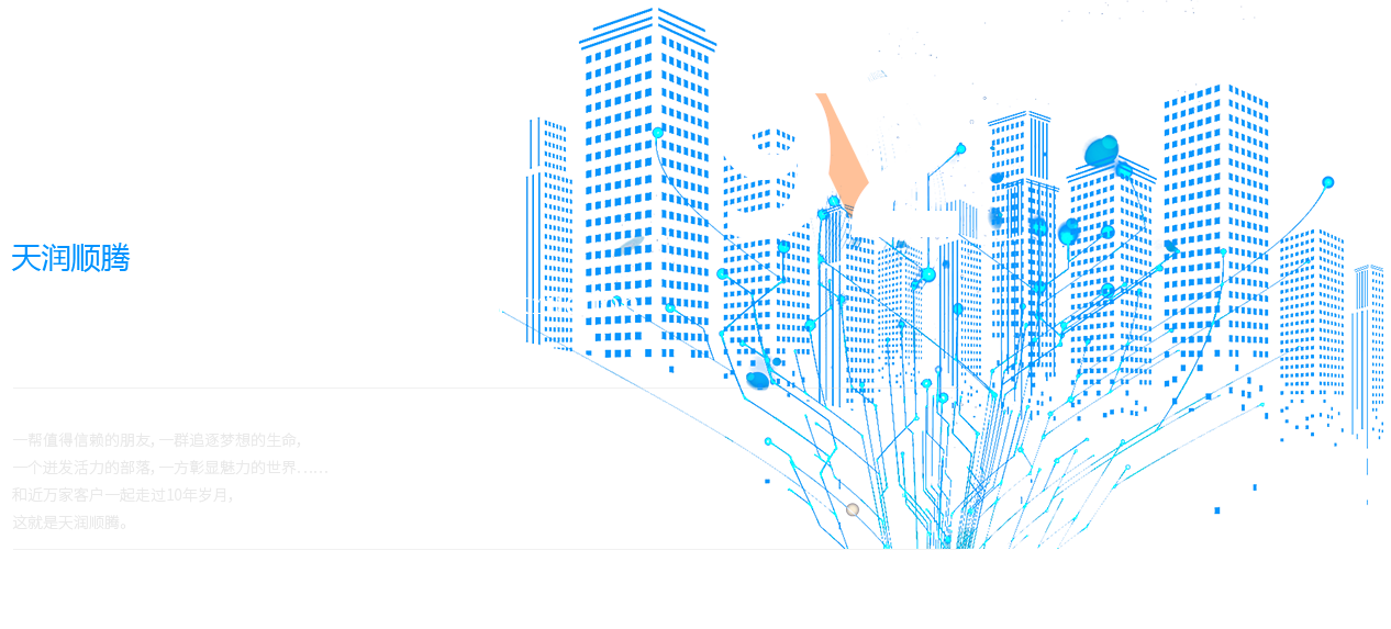 一幫值得信賴的朋友,一群追逐夢想的生命, 一個迸發(fā)活力的部落,一方彰顯魅力的世界…… 和近萬家客戶一起走過10年歲月, 這就是天潤順騰。